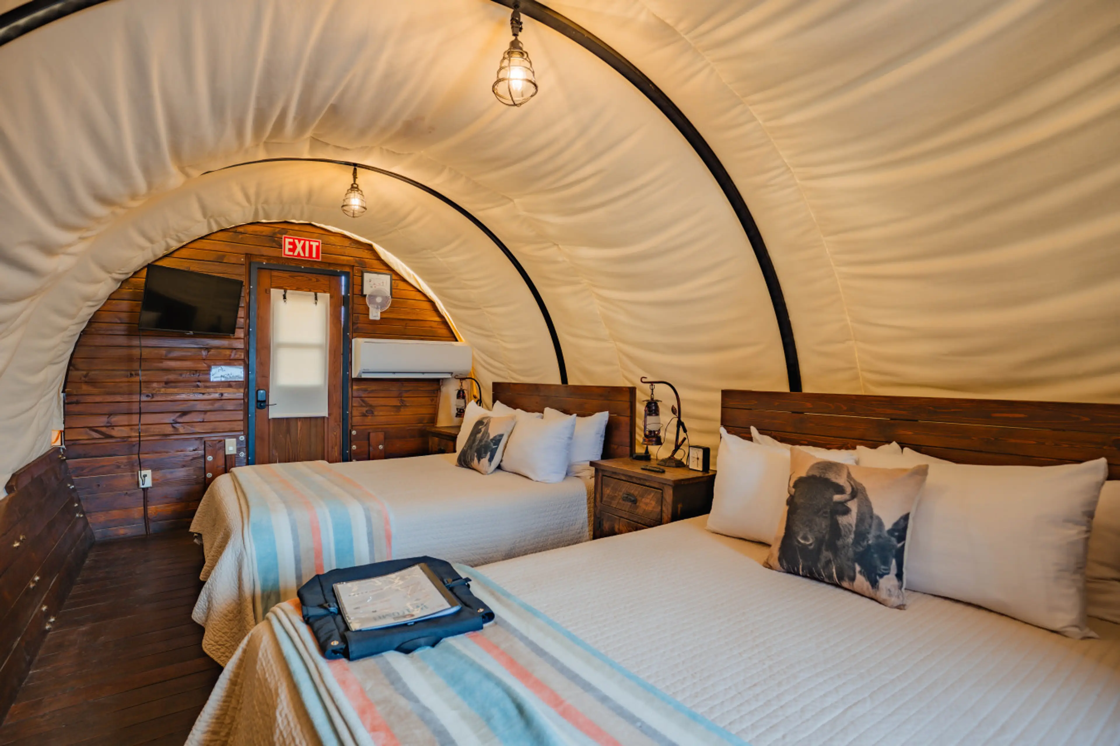 Experience a modern twist on historic western accommodations! The views of Zion National Park to the East, Smiths Mesa to the North and Gooseberry Mesa to the South are breathtaking! Enjoy the peaceful surroundings while sitting around your fire pit gazing at the star filled night sky. This wagon h...