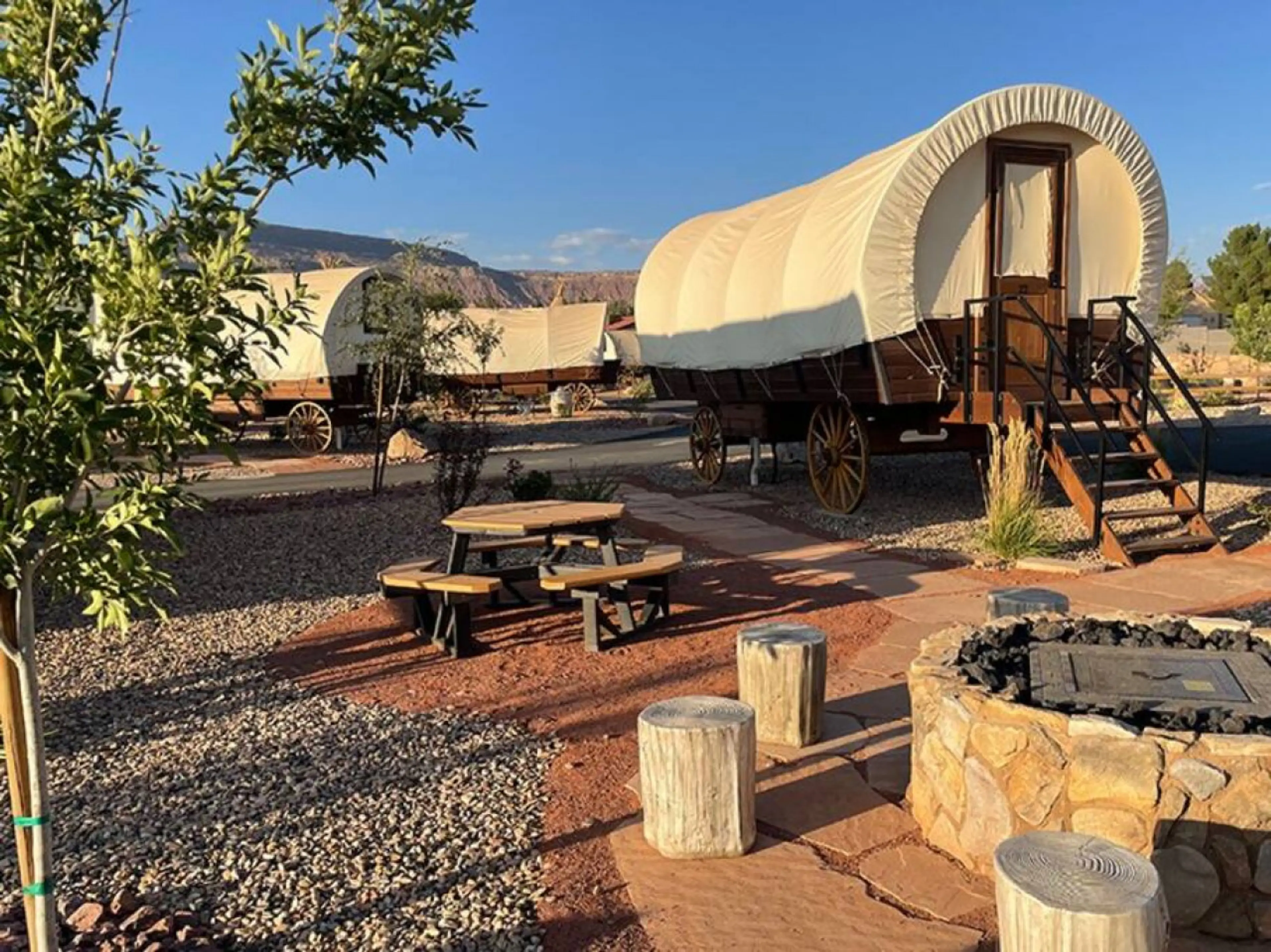 Experience a modern twist on historic western accommodations! The views of Zion National Park to the East, Smiths Mesa to the North and Gooseberry Mesa to the South are breathtaking! Enjoy the peaceful surroundings while sitting around your fire pit gazing at the star filled night sky. This wagon h...