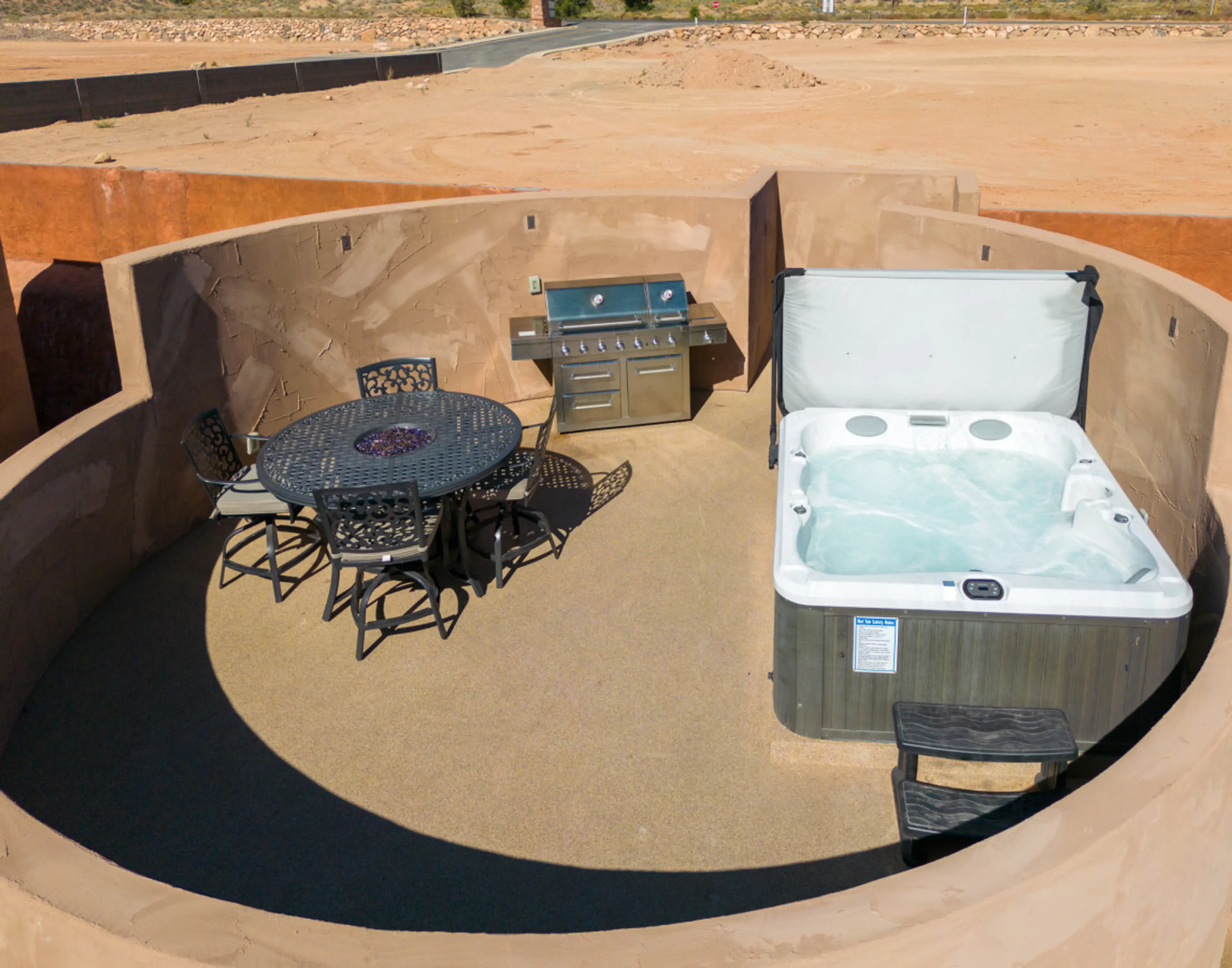 This Cliff Dwelling has 2 Queen beds with an indoor bathroom and kitchenette. The open rooftop has a fire table with chairs, a gas BBQ grill and a hot tub. This Cliff Dwelling has 2 Queen beds and an indoor bathroom with a shower, flushing toilet and a sink. Also inside the Kiva is a kitchenette w...
